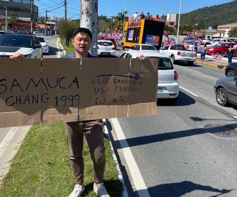 O candidato a deputado federal do Podemos Samuca Chang meteu o louco no último sábado e foi pra frente do bandeiraço da minha ex-musa BBB, a Dom Quichata Anna Carolina (PSDB), e do Paulinho Figueirense Bornhausen (PSD), com um papelão escrito a canetão: “Esse candidato usa fundão, eu não”. A ação fo...