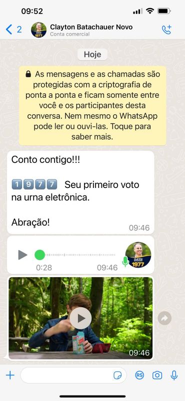 O candidato a deputado federal, ex-vereador engomadinho Clayton Batschauer (Podemos), não é nenhum desentendido. É proibido o disparo de mensagens pedindo voto em lista de transmissão no dia de hoje (só podia até ontem, sábado), no zapzap e neste momento às 09h46 está fazendo disparo. É flagrante c...