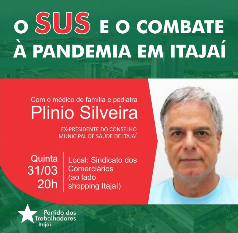 Nesta quinta-feira, às 20 horas, no auditório do sindicato dos comerciários (ao lado do shopping Itajaí) o partido dos trabalhadores da city pexêra estará promovendo palestra sobre o tema "O SUS e o combate a pandemia em Itajaí", a cargo do médico pediatra e de família, Plinio Silveira. O evento é a...