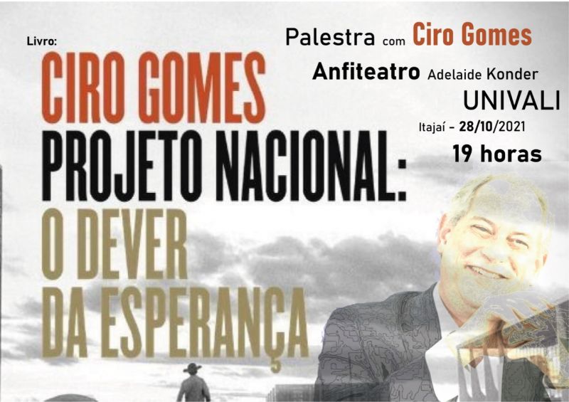 O presidenciável Ciro Gomes (PDT), estará na city peixeira, nesta quinta-feira, quando promoverá palestra no Anfiteatro da Univali, a partir das 19h. O evento com entrada gratuita, intitulado de "Projeto Nacional: O dever da esperança", pretende debater na perspctiva do seguidor dos preceitos brizol...