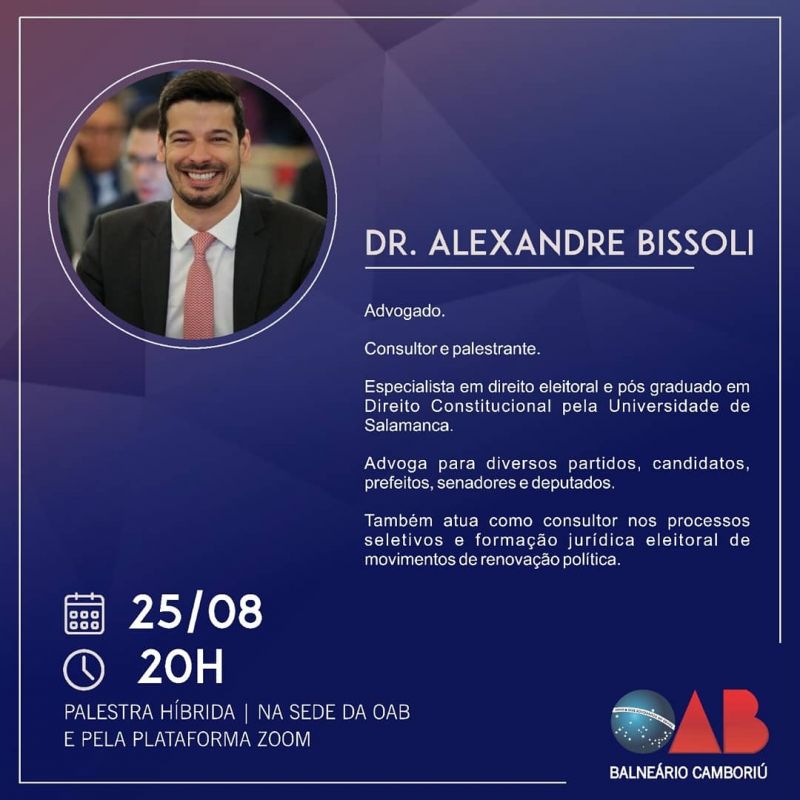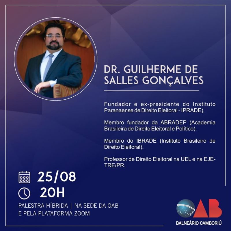 Dois grandes mestres do Direito Eleitoral, os renomados advogados Guilherme Salles Gonçalves e Alexandre Bissoli vão esclarecer as principais alterações na legislação eleitoral que devem ser aplicadas na eleição de 2022. O evento em palestra hibrida na sede da OAB de Balneário Camboriú, acontece, n...