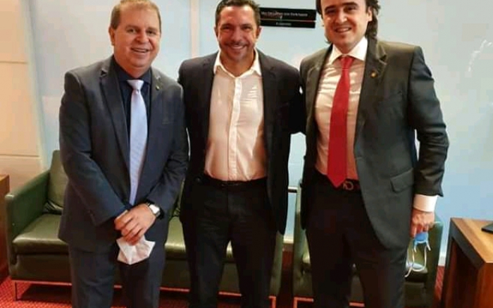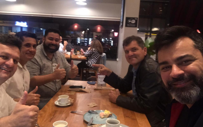 O dublê de pastor e candidato a vereador da Dubai Maravilha, Kaká Fernandes (Podemos), tem se virado nos trinta e conseguido reunir uma pastoral, digo, um apoio de peso nas igrejas e entre o empresariado local. Foto (Divulgação) Pastores Charles e Eraldo e os empresários, Nei Stelle e Leonardo, c...