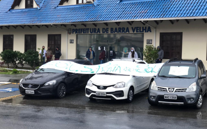 Frequentadores da Praia do Sol, entre eles, moradores e surfistas preocupados com a destruição da vegetação da Avenida Beira Mar da capital do pirão Barra Velha estão reunidos no estacionamento do prédio da prefa. Na paz Eles fazem um protesto pacífico do lado de fora da sala de licitações, ond...