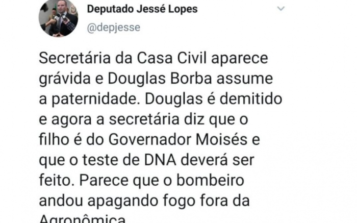 Parece que não para de chover notícias ruins na horta do governador-bombeiro Carlos Moisés (PSL). O deputado estadual Jessé Lopes (PSL), em postagem no Twitter, insinuou que o governador Moisés, teria engravidado uma barnabé da casa civil. Qui coisa, meu povo! Imagem ilustrativa