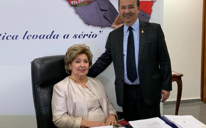 Antes da cerimônia de inauguração da sala do saudoso ex-senador bigodudo Luiz Henrique da Silveira, Dona Ivete da Silveira esteve no Gabinete do Senador Jorginho Mello (PL). Enquanto recebia cumprimentos de parlamentares, a viúva de Luiz Henrique da Silveira experimentou a cadeira que deve assumir n...