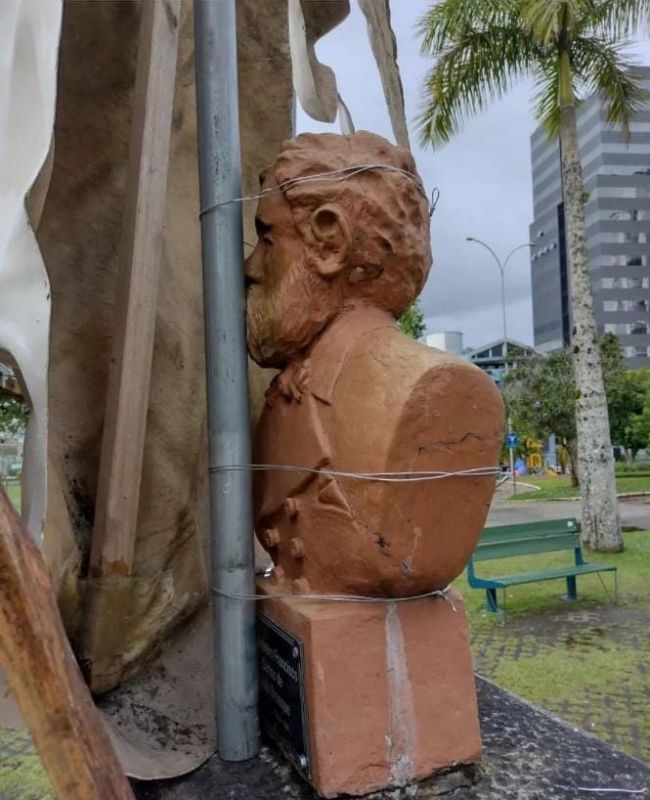 O busto em homenagem ao presidente da Província da Santa & Bela Catarina que empresta o nome à capital nacional do marreco assado, Francisco Carlos de Araújo Brusque, serviu de suporte para uma gambiarra de decoração de Natal. Uma vergonha!