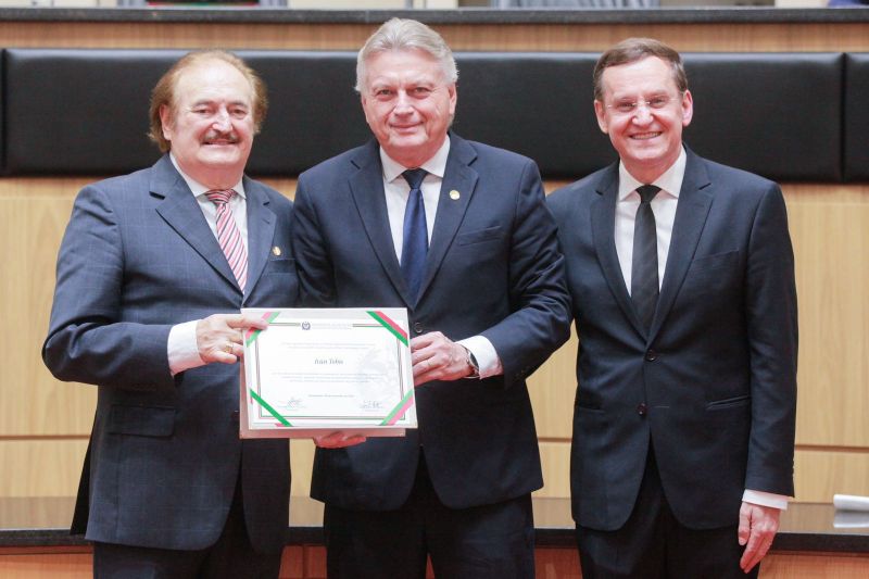 O pastor e advogado Ivan Tobis (ao centro), superintendente, secretário de cidadania e membro do Conselho Estadual de Diretores da Igreja do Evangelho Quadrangular, ao lado do ex-deputado estadual e pastor Narcizo Parisotto, e do deputado estadual Jair Miotto (União Brasil), durante sessão solene na...