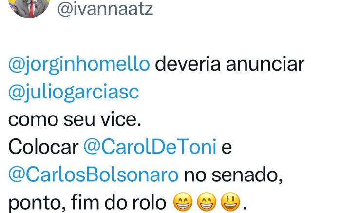 Naatz sugeriu que o seu correligionário de partido, o governador Little Jorginho Mello (PL), na sua chapa para a reeleição, deveria anunciar o deputado e presidente da Alesc, Júlio Garcia (PSD), como candidato a vice, e a deputada federal Carol De Toni e o vereador carioca Carlos Bolsonaro como candidatos nas duas vagas ao Senado. “Ponto, fim do rolo”, comentou Naatz, ao final da postagem.