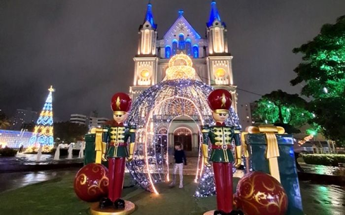 Estive dando uma olhada na iluminação de Natal no Centro de Itajaí. ‘Nada de novo nas terras de Abrantes’... normal. Mas, pelo que pude constatar in loco, as famílias com crianças gostaram muito. Todo mundo fotografando e interagindo com os objetos iluminados, como globos, presépios e balões. Tirando uma foto de frente da Igreja Matriz me pareceu tudo meio estilo Disneylândia. Menos Natal e mais Walt Disney. Feio não ficou!