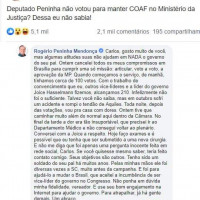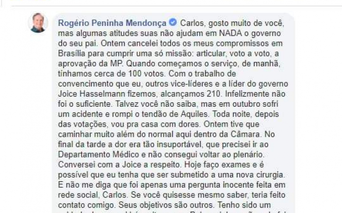 ninha O deputado federal catarina da bancada da bala, Rogério Peninha (MDB), retribuiu com sutileza a pergunta nas redes sociais do vereador do Rio de Janeiro, Carlos Bolsonaro (PSL), o filho número 3 do presidente Jair Bolsonaro (PSL) que lhe questionava que não tinha votado na questão do Coaf. Peninha, lascou, entre outras coisas que “pra atrapalhar já tinha muita gente”. Eitcha! "Ontem tive que ir ao Departamento Médico por conta do meu tendão de Aquiles, que rompi há algum tempo. A dor era insuportável, quem já passou por isso é que sabe. Como estava sendo atendido, não consegui participar de todas as votações na Câmara. Lamento que, em virtude de uma ausência no plenário, minha fidelidade ao presidente Jair Bolsonaro seja colocada à prova. #COAFcomMoro Segue minha resposta à postagem do vereador Carlos Bolsonaro: Carlos, gosto muito de você, mas algumas atitudes suas não ajudam em NADA o governo do seu pai. Ontem cancelei todos os meus compromissos em Brasília para cumprir uma só missão: articular, voto a voto, a aprovação da MP. Quando começamos o serviço, de manhã, tínhamos cerca de 100 votos. Com o trabalho de convencimento que eu, outros vice-líderes e a líder do governo Joice Hasselmann fizemos, alcançamos 210. Infelizmente não foi o suficiente. Talvez você não saiba, mas em outubro sofri um acidente e rompi o tendão de Aquiles. Toda noite, depois das votações, vou pra casa com dores. Ontem tive que caminhar muito além do normal aqui dentro da Câmara. No final da tarde a dor era tão insuportável, que precisei ir ao Departamento Médico e não consegui voltar ao plenário. Conversei com a Joice a respeito. Hoje faço exames e é possível que eu tenha que ser submetido a uma nova cirurgia. E não me diga que foi apenas uma pergunta inocente feita em rede social, Carlos. Se você quisesse mesmo saber, teria feito contato comigo. Seus objetivos são outros. Tenho sido um soldado do seu pai há muitos anos. Pelas minhas mãos ele foi diversas vezes a SC, muito antes da campanha. E foi para ajudá-lo a mudar o Brasil, que aceitei a incumbência de ser vice-líder do governo no Congresso. Não ponha em dúvida minha fidelidade, vereador. E use seu bom engajamento na Internet para ajudar o governo. Para atrapalhar, já há gente demais. Um abraço." Foto (Divulgação) Imagem ilustrativa