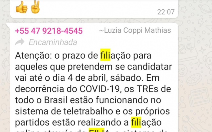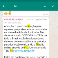 Enquanto o povo tá se estrebuchando na lida, pegou mal uma postagem da ex-prefeita loirosa Luzia Coppi (PSDB) da capital da pedra e ex-do tiro ao vereador, avisando em grupos o prazo pra filiação de quem pretende se candidatar nas eleições deste ano. Lógico que o aviso é pertinente para os pré-candidatos de Camboriú e região, mas, teria sido disparado em grupos, onde ninguém tava se preocupando com o assunto. Linguarudos de plantão lascam que foi um ato de insensibilidade, dizendo que invés da ex-prefeita se colocar pra ajudar quem precisa 'só pensa naquilo...' Arreda, raça de infelizes! Foto e imagem ilustrativa do zapzap (Divulgação)
