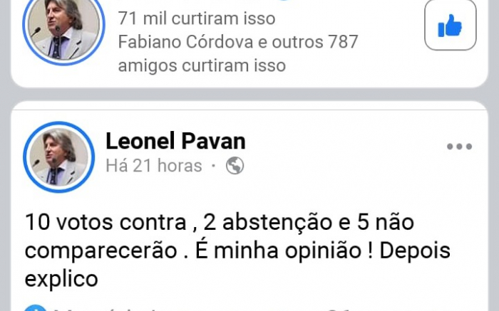 O ex-governador atucanado Leonel Pavan (PSDB), em postagem nas redes sociais, opinou de que o governador Carlos Moisés (PSL), escapa da votação que pode lhe empurrar pra seis meses fora da principal cadeira estofadinha do palácio da Agronômica. Pavan, diz que acredita que serão dez votos contra. Outros cinco deputados, não estariam presentes na sessão e mais dois deputados ficariam em cima do muro se abstendo de votar. Não contente em opinar, ainda deixou no ar que depois explicava. Hummmm... Foto-imagem (Divulgação)