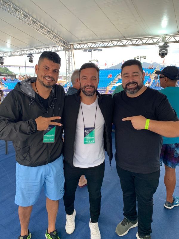 Os semifinalistas da chave principal do Mundial Balneário Camboriú de Beach Tennis Embraed, foram definidos nesta sexta-feira, nas quadras do Pontal Norte. Os jogos das semifinais femininas e masculinas da competição de nível ITF BT 400 vão acontecer sábado, a partir das 10h. O Deputado Federal Daniel Freitas, está na Maravilha prestigiando as competições, na imagem o deputado federal Daniel Freitas (PL), com o chefe de gabinete Jorge Davi e o vereador Kaká Fernandes (Podemos).