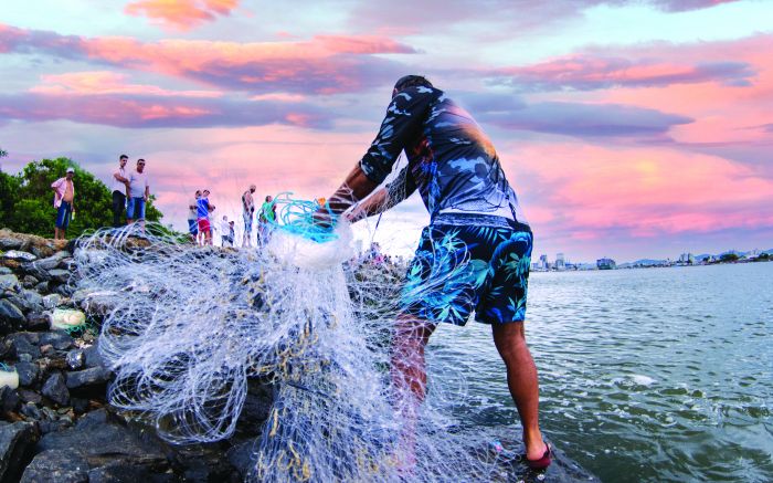 Pescador tarrafeando no Molhe da Barra em Itajaí