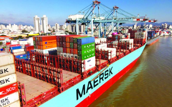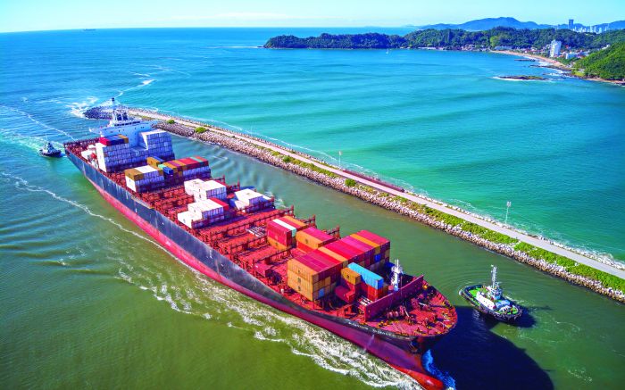 Navio cargueiro saindo do complexo portuário de Itajaí rumo ao seu destino