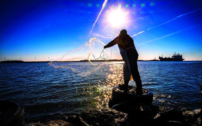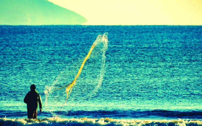 Pescador Francisco lançando sua tarrafa, Molhe da Barra, Itajaí