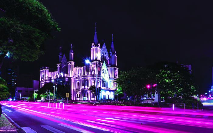 Visual do centro de Itajaí, à noite, com a Igreja Matriz de fundo