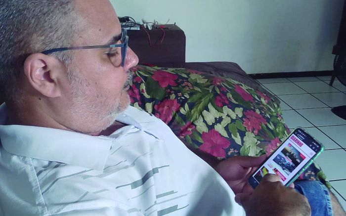 Radialista Celso Rikardo acessa o conteúdo pelo celular (Foto: Acervo Pessoal)