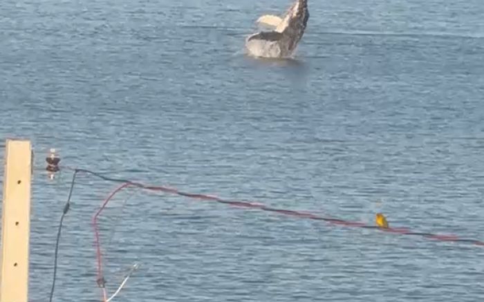 Surfistas, moradores locais e banhistas registraram o espetáculo dado por uma baleia jubarte e seu filhote na praia do Estaleiro, na tarde de segunda-feira, em Balneário Camboriú.