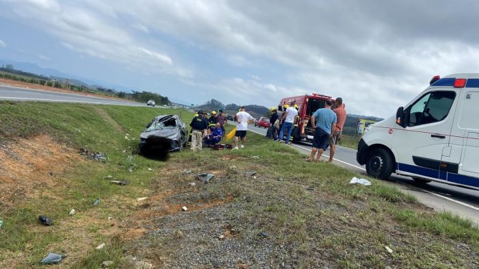 Uma batida por volta do meio-dia deste domingo deixou feridos no quilômetro 25 da BR 470, no bairro Baú Baixo, em Ilhota. Um Fiat Punto e um Toyota Yaris se chocaram, os dois saíram da pista e o Toyota capotou na vala central que divide as faixas da rodovia federal.