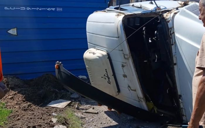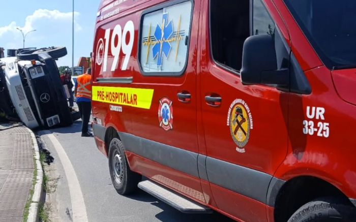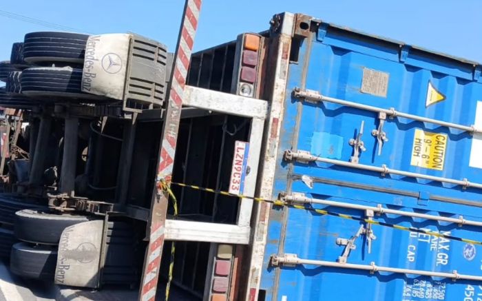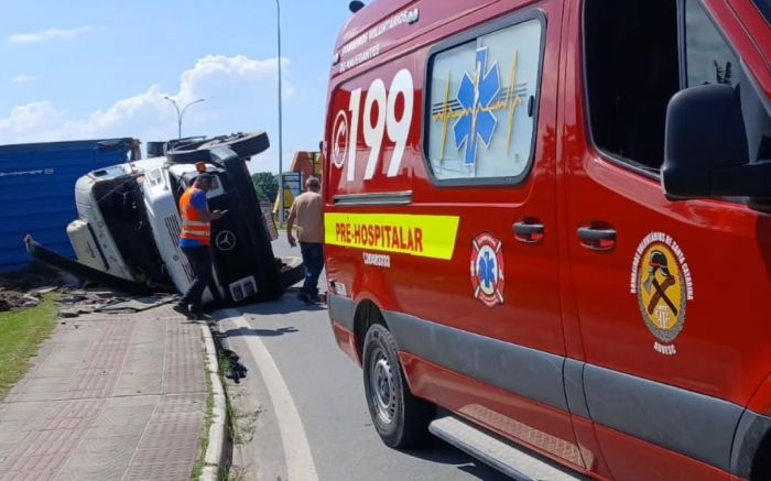 Um caminhão-contêiner tombou no início da tarde de segunda numa calçada da via expressa portuária, em Navegantes, nas proximidades da loja Havan. O acidente, apesar de ser sobre a calçada, não deixou feridos.