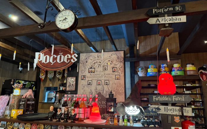 O bar temático de Harry Potter é um show à parte. Entrar ali é como atravessar a parede da plataforma 9¾. As luzes, os detalhes do cenário e os objetos icônicos criam uma atmosfera digna de Hogwarts. E os drinques? Cada um é preparado como se fosse uma aula de poções: cheios de efeitos, cores que mudam, fumaça saindo do copo e nomes que fazem qualquer fã surtar. A cada gole, uma experiência mágica e única, que desperta a sensação de estar realmente dentro do universo bruxo. Não é só beber — é viver uma cena do filme.