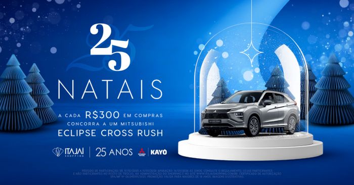 A partir de 17 de outubro, a cada R$ 300 em compras nas lojas participantes, o cliente ganha um cupom para concorrer a um Eclipse Cross Rush, em parceria com a Kayô Mitsubishi — um modelo moderno, estiloso e perfeito para começar 2026 acelerando novas conquistas. A campanha vai até 11 de janeiro de 2026.