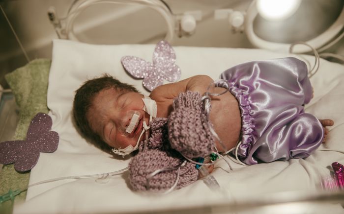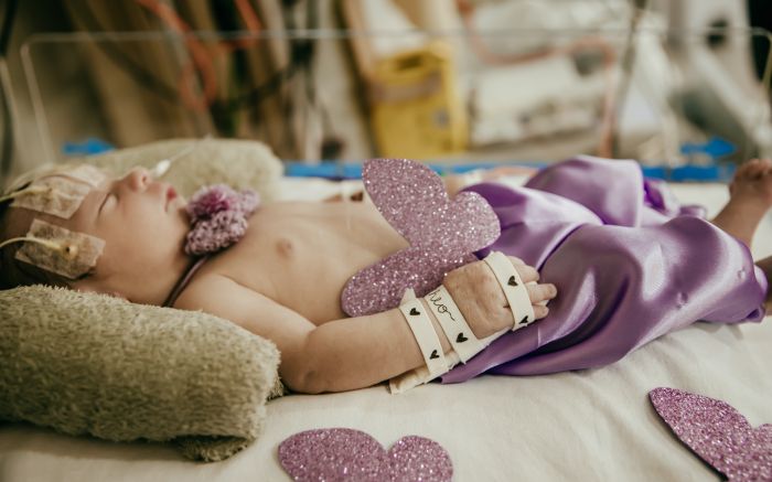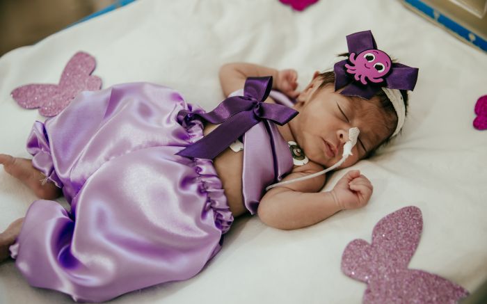 Tiara na cabeça com saia de tule. Luvas de lã, calça brilhante, borboletas e até uma lula rosa com lacinho. Foi assim que os bebês prematuros internados na UTI Neonatal do Hospital e Maternidade Marieta Konder Bornhausen foram vestidos para uma sessão especial de fotos clicadas pela fotógrafa Simonne Santos.
