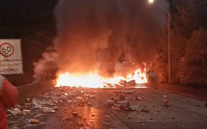 Caminhão e van pegaram fogo e motorista morreu; fila chega a quilômetros na descida da serra