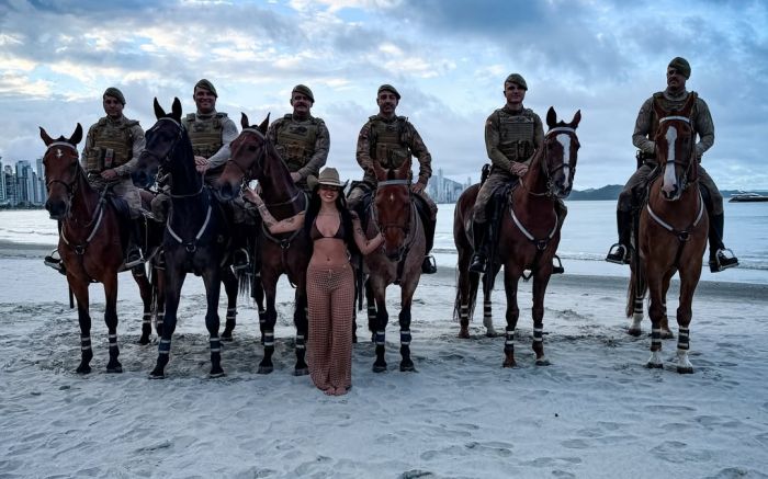 E Ana Castela, que sempre entrega o lado “boiadeira”, fez questão de honrar o apelido. Durante a gravação, ela encontrou a cavalaria da PM e fez foto com os policiais e os cavalos. O vídeo foi parar nas redes do 12º Batalhão.