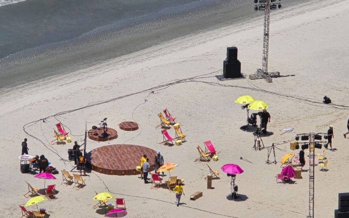 As gravações rolaram entre segunda e terça-feira, num trecho da orla já revitalizado e que foi fechado especialmente para a produção. Não era evento aberto ao público, mas o público tava lá. O clima era de bastidores de verão mesmo — luz, sol, mar e aquela beleza que BC entrega sem esforço.