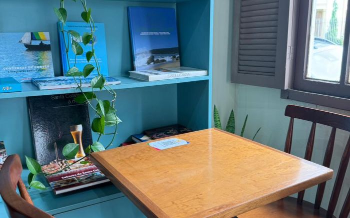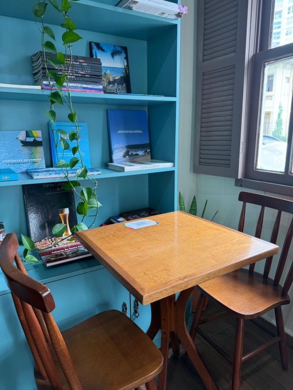 Um dos detalhes mais encantadores da Don’Ana é a prateleira enorme de livros disponíveis para qualquer cliente. Tem romance, poesia, clássicos da literatura e obras sobre Itajaí, como livros do historiador Edison D’Ávila.