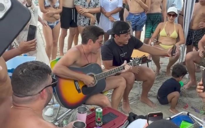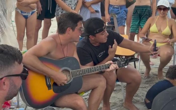 O cantor Bruno Belutti, da dupla Marcos e Belutti, está curtindo o início de ano em Balneário Camboriú. Após fazer show em Porto Alegre, ele veio de ônibus até o litoral catarinense, mesmo com o ar-condicionado do veículo quebrado.