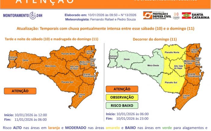 Segundo a Defesa Civil de Santa Catarina, há condições para temporais entre a tarde deste sábado e o domingo. Entre a tarde de sábado e a madrugada de domingo, o risco é alto em todo o estado para alagamentos e enxurradas. Já para ocorrências como destelhamentos, danos na rede elétrica e queda de galhos e árvores, o risco varia de moderado a alto.