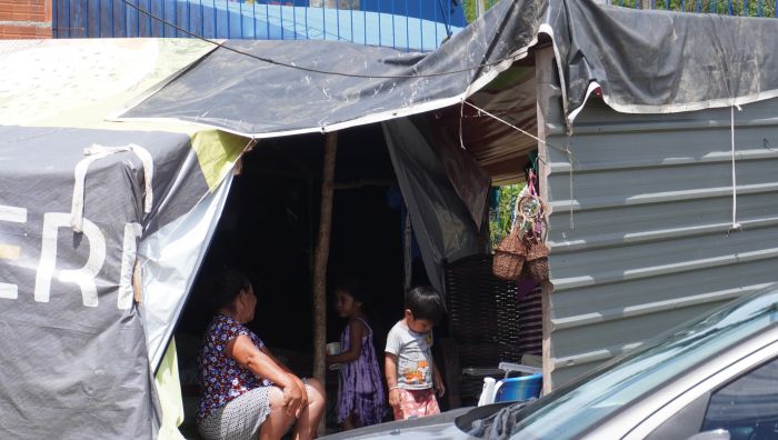 Os indígenas ocuparam a área destinada para as obras de ampliação da Casa de Passagem. No local, as famílias montaram um acampamento com várias tendas e barracos de madeira cobertos de lona. O tapume metálico da obra foi aproveitado como parede e pra apoiar cobertura de barracas. As condições são precárias, em meio à lama, poças e mato.