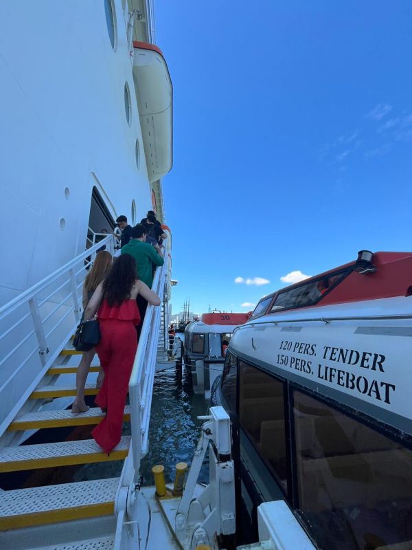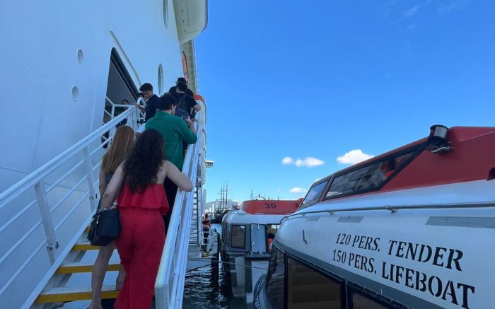 Depois da área de espera, vem um dos momentos mais aguardados: o embarque no tender, a embarcação que leva os passageiros até o navio, já em alto-mar. Durante o trajeto, com Balneário Camboriú ficando para trás, dá aquele clima de: a viagem começou de verdade.