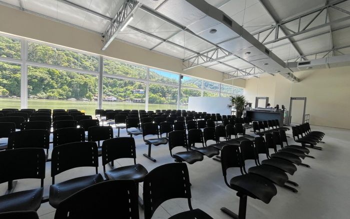 Logo na chegada ao atracadouro, o clima já é de viagem começando. O check-in acontece de forma organizada, com conferência de documentos, despacho de bagagens e passagem pelo raio-X. Tudo flui com tranquilidade. Depois, os passageiros aguardam em uma área ampla e confortável, com cadeiras e vista privilegiada, dá para ver o bondinho do Unipraias, o Barco Pirata — cenário que ajuda a transformar a espera em parte da experiência.