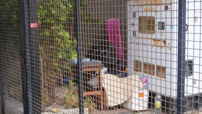 A cobrança é pra que o dono feche o terreno com tapumes até a futura destinação do imóvel para que os andarilhos evitem se abrigar no local. Mesmo no pátio interno há sinais de ocupação, com roupas e outros materiais guardados, além de lixo. Na frente da fachada, há embalagens de marmitas jogadas e muito cheiro de xixi.