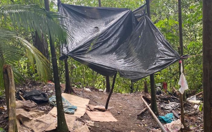 No meio do mato, os agentes encontraram uma tenda improvisada, papelões espalhados no chão e algumas sacolas. Uma mulher estava no local no momento da ocorrência. Ela recebeu a oferta de ser atendida pelo resgate social, mas recusou e deixou a área voluntariamente.