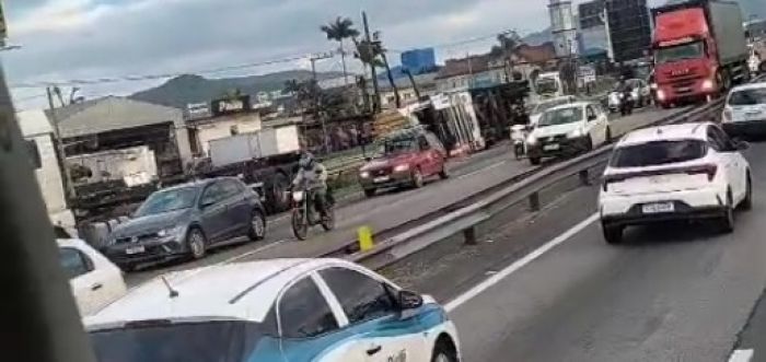 Uma carreta tombou por volta das 4h30 de quarta-feira no km 115 da BR 101, em Itajaí, próximo ao local onde outro acidente foi registrado no mesmo trecho. O veículo ainda não havia sido removido até a manhã desta quinta-feira e provocou lentidão no trânsito no sentido norte da rodovia.