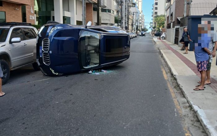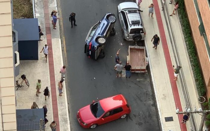 Um acidente envolvendo dois carros e um semirreboque terminou com uma BMW X1 com duas rodas pro alto na tarde de quinta-feira, em Balneário Camboriú. O capotamento aconteceu por volta das 15h30 na rua 2300, no centro.