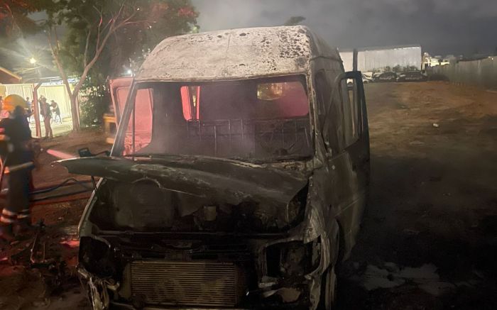 O veículo foi completamente destruído pelo fogo. A Polícia Militar informou que o furgão estava no pátio da Polícia Civil para processo de baixa e não tinha placa de identificação.