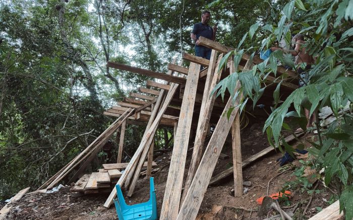 A casa estava no topo do morro, em meio à vegetação. Para chegar até o ponto, era necessário subir uma escadaria de pedras improvisada.