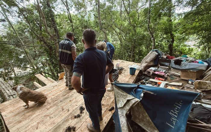 No local, foi encontrado um casal com um cachorro da raça pitbull. A estrutura já tinha vigas de sustentação e parte do assoalho pronta. Também havia grande quantidade de lixo, incluindo três colchões.