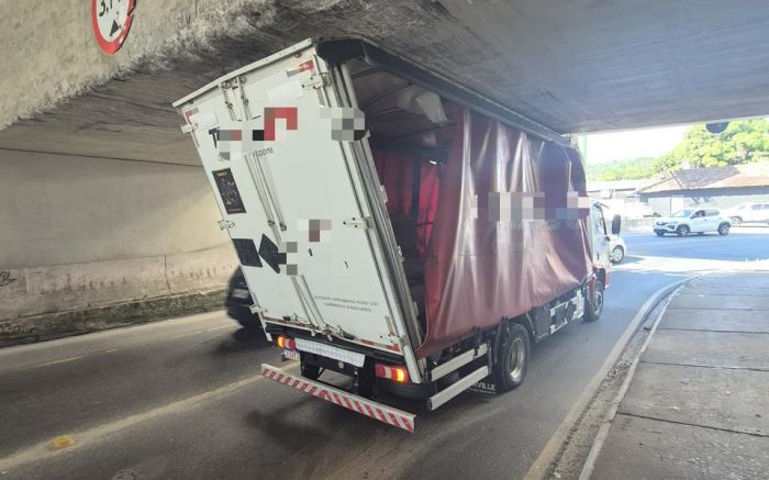 Mais um caminhão fica entalado em viaduto