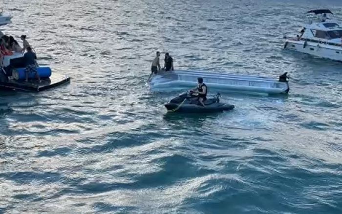 A Kombi foi adaptada sobre flutuadores para passeios turísticos. Em vídeo gravado no momento, um homem relata que todos estavam bem, inclusive crianças que estavam na embarcação.