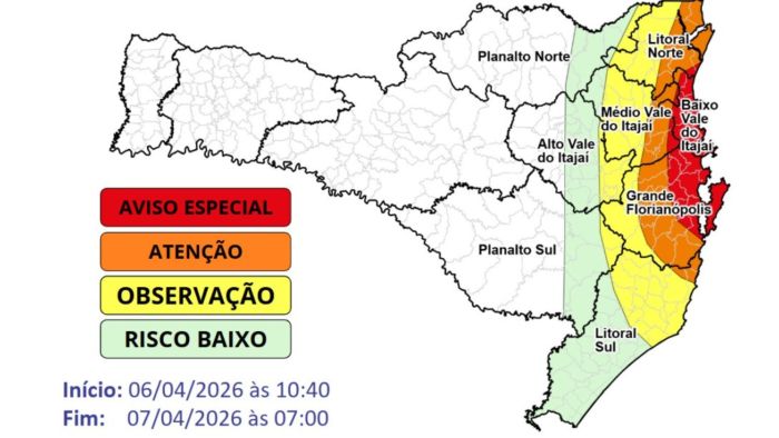 De acordo com o órgão estadual, o avanço de uma área de baixa pressão no interior do continente e o reforço da umidade vinda do mar favorecem chuva persistente e, por vezes, forte. Para o baixo vale do Itajaí e parte da grande Florianópolis, a previsão indica acumulados médios entre 80 e 130 milímetros, com pontos acima disso.