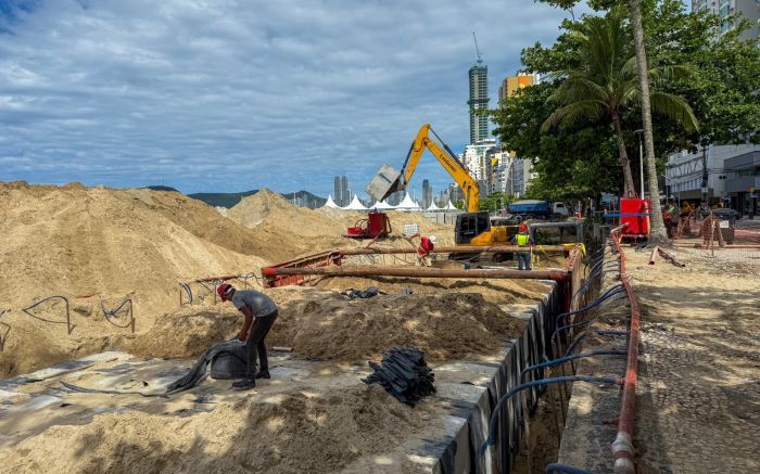 Os trabalhos da macrodrenagem avançam em Balneário Camboriú com a ligação entre a galeria da praia com a do canal Marambaia, na altura da rua 1001, nesta quinta-feira. Se não chover, começa a instalação da caixa subterrânea na avenida Atlântica, em frente ao cruzamento.